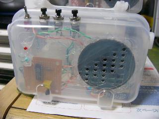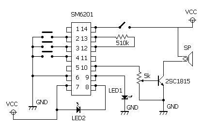 | 秋月電子通商の通販でSM6201を入手しました。そこで参考資料を基に実際に製作してみました。このICは型番の後に番号が書いてあってその番号で書き込まれている曲目が違うようです。秋月ではSM6201-2とSM-6201-4をセットで販売していましたので下記のようにそれぞれ1つずつ製作してみました。実際に作った配線図及びパターン図もこのページの下にあわせて紹介しています。ぜひ、あなたも挑戦してください。(2008年3月) | ||||