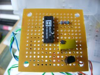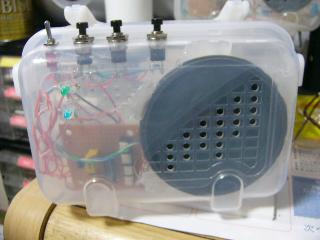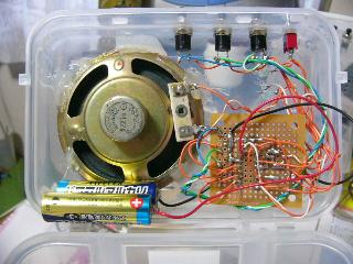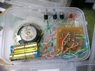 | SM6201と言うICは14ピンのICでメロディーが三曲入っています。2.3.4のスイッチが選択スイッチで各曲を単独で鳴らします。14ピンのスイッチはこれを入れておくことにより曲を順にエンドレスで鳴らします。12.13ピンで基本の音程が決まりますのでこの抵抗値を変えると曲のトーンも変わります。基本図から変更した場所は1番ピンの接続を廃止しました。あわせて5番ピンもつないでいません。この2つの端子で強制停止するのですが必要ないのでつけていません。11番は無接続端子で何もつながなくてかまいません。トランジスター2SC1815は汎用の2SCタイプのものだったら大抵間にあいます。手持ちのものを使っただけですよ。音が割れるので10ピンに音量調整の半固定のボリュームをつけました。半固定ボリュームは調整の仕方次第ではICのOUT端子10ピンとベース入力が直結してしまいますので調整前に抵抗値の中間程度からはじめましょう。配線が多いので誤配線に注意してくださいね。作品の音の感想ですが単調な高音のオルゴール音ではなくて深みのある良い感じです。スピーカーをある程度大きくしているからかそれとも和音 が入っているからかも。 | ||||