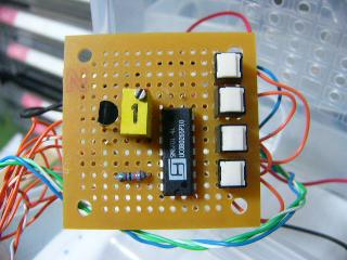 | 下記はSM6201-4のICを使った作品です。曲目は1.Jingle Bell 2.We Wish You a Merry Christmas 3.Santa Claus is Comig To Town です。こちらは先に製作したので基板テストの目的でタクトスイッチをつけています。作品の外観の左上にスナップスイッチがつけてあります。このスイッチを入れておくと押しボタンに関係なく三曲を順にエンドレスで鳴らします。スイッチを切ると演奏中の曲が終わると停止します。隣の三個の押しボタンはスナップスイッチを切っているときに押しますと押されたスイッチの曲だけが一曲なって停止します。緑のLEDは演奏中点灯していて演奏終了とともに消灯します。水色(実際は青色)のLEDは曲の演奏にあわせて点滅します。 | ||||