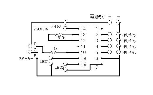 | 下記はSM6201-2のICを使った作品です。曲目は1.ゆりかごの歌 2.ブラームスの子守唄 3.ロッカビイバビーです。こちらは後から製作したので右の作品と違って基盤上の押しボタンは省いています。部品が4点しかないので寂しい基板ですがそのぶん配線がいっぱいです。下の配線図どおりに製作して下さいね。製作した作品の外観の左上はスナップスイッチがつけてあります。このスイッチを入れておくと押しボタンに関係なく三曲を順にエンドレスで鳴らします。スイッチを切ると演奏中の曲が終わって停止します。隣の三個の押しボタンはスナップスイッチを切っているときに押しますと押されたスイッチの曲だけが一曲なって停止します。赤のLEDは演奏中点灯していて演奏終了とともに消灯します。水色(実際は青色)のLEDは曲の演奏にあわせて点滅します。 | ||||