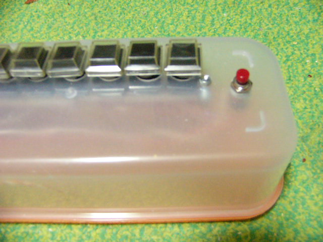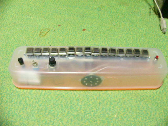 | 完成品全体写真 配線図及び部品表は別ページにあります。演奏は向いがわからします。ケースは100円ショップで買いました。 | 赤いスイッチ(押しボタン)がリセットボタンです。演奏の中止や 録音内容の消去などが出来ます。 |