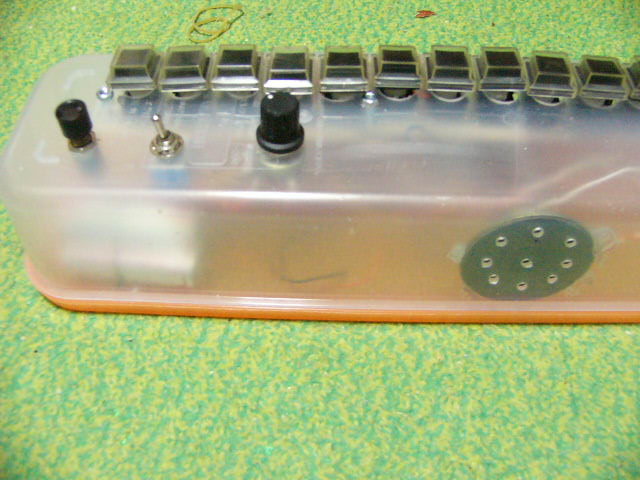 | キーはパソコン用のものです。左から再生用押しボタン。オルガンとメロディー切り替え用スナップスイッチ。電源スイッチ兼音量調整ボリューム。観客側に向けたスピーカーなどです。 | ケースの中です。天地を逆さまにして使用しています。キーボードは小さな基板を4枚繋ぎ合わせています。配線が多いので誤配線に注意してください。 |