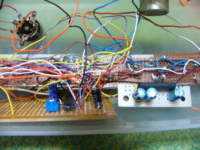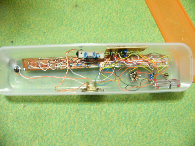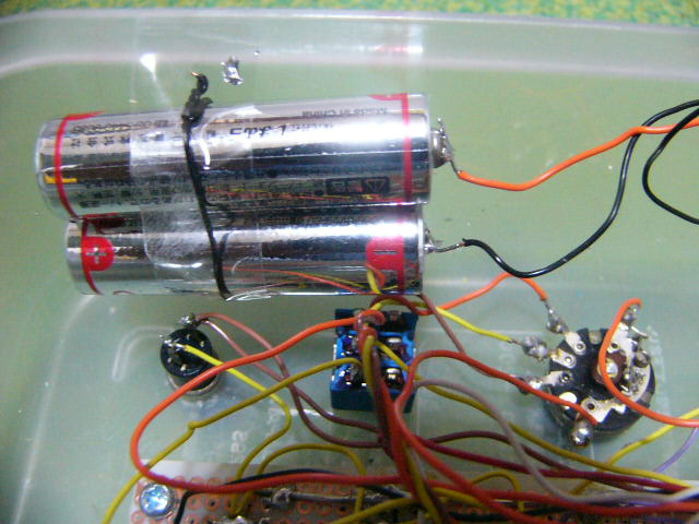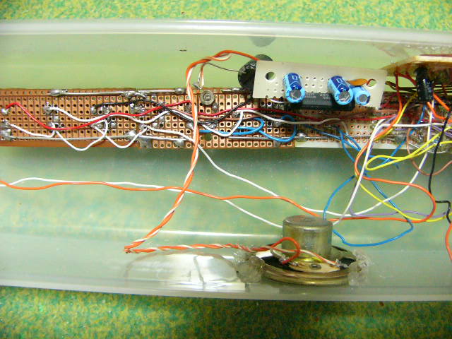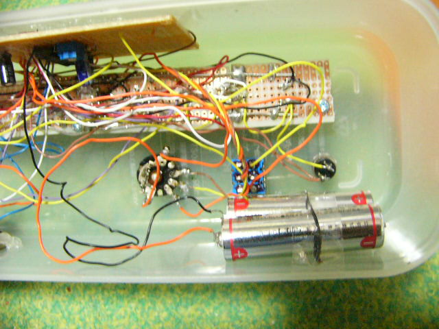 | IC基板は側面に固定しました。電池は直接半田づけ(^^;しています。配線を色で管理しないとごちゃごちゃしてわからなくなってしまいます。 | 音声用基板をオプションでつけてみました。別ページの配線図にはこの回路はついていません。回路図とおりでも充分な音量なのですが迫力UPを狙いましたが、電池の消耗がぁー。(T0T) |