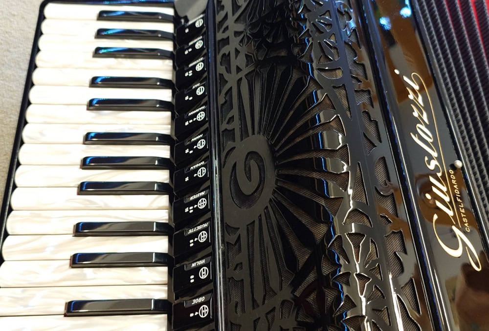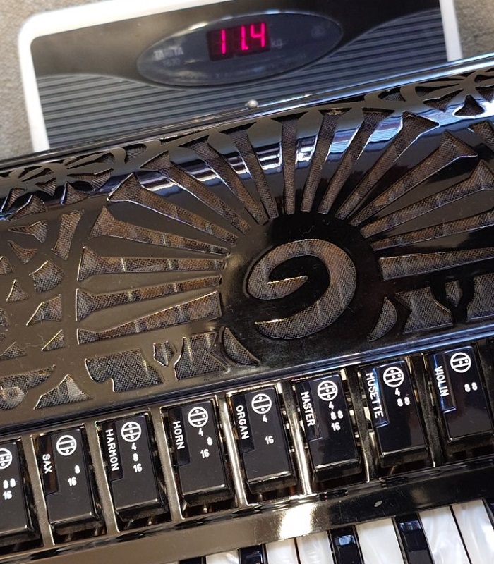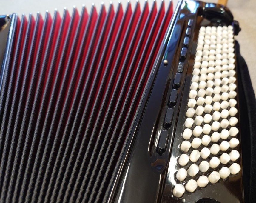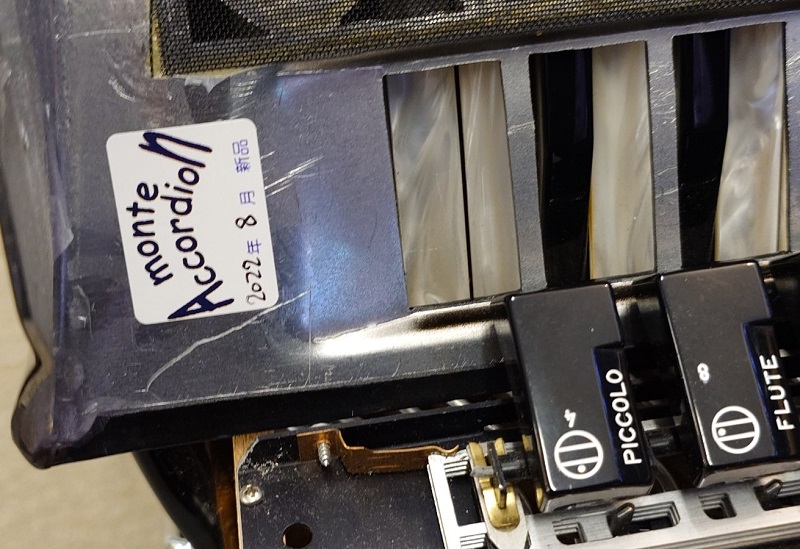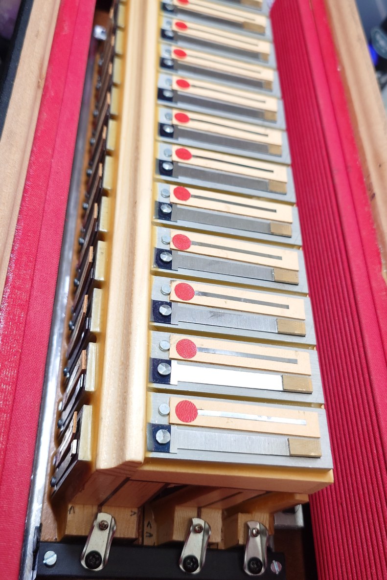 イタリアの老舗ブランドGiustozziの41鍵盤、120ベース 41鍵盤、HMML、MLチャンバー スイッチは15個あるので可能な組み合わせは全て網羅 マスターパームスイッチもあります 鍵盤はパール仕様 120ベース、スイッチは9個 ベースレジスターが9個ある楽器は珍しいです ボタンはパール仕様 蛇腹の中は赤 当店で2022年8月に販売した楽器です 新品と言えるような状態 右手側のリード リードはハンドメイドリードです 当店で販売した物なので輸入後の整備は完了していますが 調律はやり直しますのでMMの波の速さも任意に決められます ベースリード こちらもハンドメイドリードで5セットあります 最低音リードの木枠がL字タイプなので豊かな低音が得られます 重さは実測で11.4kg 近年のこのクラスとしては標準的か少し軽い重さです フルサイズ、ダブルチャンバーで12kg以下なら軽量と言えます ※アコーディオンの重さは実測値以外は信用できません カタログ値より大幅に重くなっている事もあります |