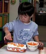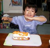 おうちに帰ってからは お母さんとケーキを 作ったよ。 飾り付けは峻の係り。 |