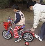 | 2001/11/18 補助なし自転車の練習へ。 取りあえず、片方の補助輪を はずして、おそるおそる練習。 |