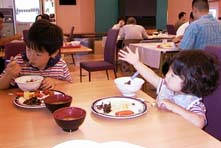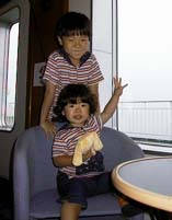 | 船で一晩過ごしたけど、熟睡出来たよ。 朝は船のレストランでバイキング。もりもり食べたよ。 外は生憎の雨と風。なので、船の中で遊んだよ。 |