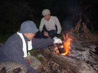 泊まりの釣りは初めてという石原さん、火起こしにチャレンジ
