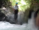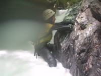 | トイ状滝は近づくのも難しいが、つっぱって足を置くところにごーごーと水がぶつかっていて無理。巻いてロープを使用して下る |