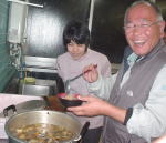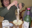 | ツアー参加者に、山田さんの友人(ネコちゃんクラブ関係)が加わり、鍋、すき焼き、自然薯、きのこ卵とじ、などなどを作りながら飲み、食らう。山田さんの準備していたアミタケ酢の物やぜんまい煮付けなどもうまい。地震で崩れた地区に寝かせておいたワインも引き出すとうまい! |