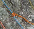 プルージック、アセンション、タイブロックを試す。プルージックはロープ、スリング両方の太さや硬さで利かないことがあるので注意。8mm前後のロープに対するスリングは、やわらかい5mm、芯抜き6mm(7mm)、4mmなどを準備する必要がある。 |