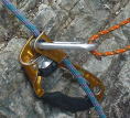 セカンドの確保に使用したATCガイド。ATCーXP(ATCの片方の出口が溝になっている)にわっかをくっつけたもので、ATCとして使用できる他、セカンドの確保には写真のようにセットするとルベルソのように使え、手を離しても流れない。