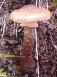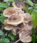 小雨の中、カッパを着てハンノキ・カラマツの生えている林道を歩いてゆくと、脇にナラタケ群生。が、妙にしっかりしている。通常のナラタケに比べ、柄が太く、茶色地に淡褐色鱗片がはっきり。私が以前トウヒ林床で採って食べ、当たった(戻した)やつ(下の写真)によく似ている。 |