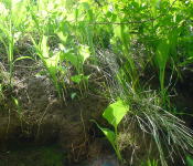 | とある古道を登る。道の脇の山菜は伸び気味なので、横切る沢を登ってみる。 |