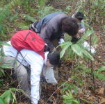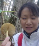 Iさんがキナメツムタケ発見(写真はTさん)、まわりに続々見つかる。状態よし。 |