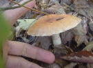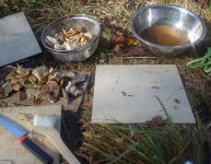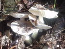 | 午前の部は昼飯のおかず採り。ヤブ急斜面を下る。数分でYさんが白いでかいのを発見。それはムラサキシメジなのです。色は抜けているが虫食いの進んでないのがあったので昼飯用に確保。 |