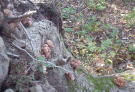 | がさがさとヤブをこぎ、Nさんはクリタケを見つけた。ヤマブシタケの乾いたのが木についていた。 |