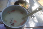 当ツアーでは珍しく、車のそばで昼食。シチュー用には水洗い、炒め物用はなるべく水を使わずにそうじ。のんびりして、午後はがんばりましょう。 |