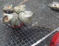 さざえはぽつぽつ見つかって楽しい。かきはたくさんあるが、採るのに少々苦労する。Kさんは立派なあわびをゲット。さすが。 |