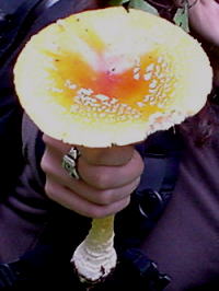 | 実例2 八ヶ岳山麓で8月末採取。タマゴタケとまぜて油いため。炒めるとツボのかけらがとれてしまい、区別がつかない。味も同じ。同行者に食べさせたところ、1時間後からふわふわした感じ(特に気持ちよくも悪くもない)がし、1時間ほどで消えた。彼はまるまる1個も食べていない。 | ||