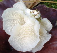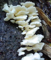 9月、まだ他の腐朽菌が木に生えないころから大量に生えてうれしい。紅葉のころまで。 ブナの立ち枯れに群生する様子は見事。倒木にも。 歯ごたえが独特で、焼肉の「みの」を軟らかくした感じ。 |
