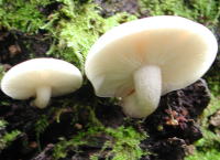 大きくなると白くなり、大理石模様は消える。 まっ白になると下のナゾのきのこ(図鑑で見当たらない)を注意。2人が食べて翌朝ひどくおなかが痛くなった。多数株立ちする。ブナシメジは下のようには多数まとまらないのが通常。 |