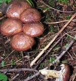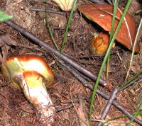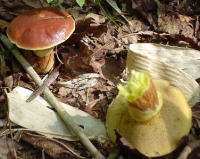 | 濡れているともっと鮮やかで てかてかしていて見つけやすい 傘は茶色、柄と傘裏の管口は黄色 右の幼菌は管口がまだ出ていない これぐらいが上品であるが、大きくなってもよい。ただし大きいのは腐ったり虫が入ることが多い |