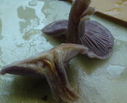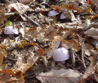 紅葉期やや遅め、鮮やかな紫色で群生というかライン状(菌輪?)に多数発生する。ナラ林床。大きくなると白っぽくなり、20cmにもなるが、そのころは腐って虫が入って食えない。採る場所により土臭いこともある。 |