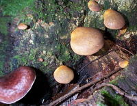| こうして見るとシイタケのようでうまそう。 天然シイタケは水の上などの湿ったところに出ることが多い。普通の立ち枯れにどばーっとバラバラに群生しているのはツキヨタケで、ムキタケも生え方は似ている。ヒラタケは株立ちするのが普通。 この辺も決定打ではない。 |