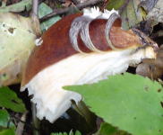大きくて群生しておいしそうなきのこ...だが毒性は強いそうである。 ブナの倒木や立ち枯れによく生える。紅葉前から紅葉期。紅葉後は溶けてなくなっていることが多い。 シイタケ、ムキタケ、ヒラタケなどの「片葉」で肉厚のきのこと似ている。ただしシイタケやヒラタケと同様、倒木の上面では傘が丸くて柄が中心に付くものもある。 |