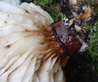 | 決め手はこれ!柄は短いがしっかりとあり、傘との境目がツバ状に隆起している。これは特徴的であるが、「片葉」のきのこはいずれも柄が短くて見にくい。 シイタケの柄は短いながらも太さよりは長く、ツキヨタケの柄は太さより短い。 褐色がかった柄と白いひだひだとの境目が隆起しているのがわかる。 |