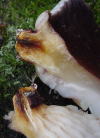 割ると茎の内部が黒くなっていることが多いが、小さめのツキヨタケで黒くないのもあるので、「黒いシミがないから大丈夫」という決め手にはならない。 | |