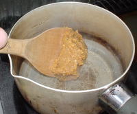 | 刻んだふきのとうをサラダ油で炒め、味噌、酒、砂糖をまぜてもよい。配合と炒め具合で、こってりするような、香ばしいような気もする。酒のアテ的に食うにはこっちかな。 | ![]() |