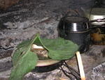 | 葉っぱがでかいのでいろいろ重宝だ。 お皿代わり、雨ゴミよけのフタ代わりに。 使用後は燃やすなりヤブに捨てるなりしてお手軽。 アルミホイルのようにイワナをくるみ、茎のスジでゆわえるとなんとか包み焼きもできる。焼きからしの温めによい。 |