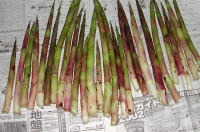 | むき方:たてに切れ目を入れてむくと早い。あるいは先っちょを折って下にびりびりと破ってから左右に広げる。爪に皮が入るので注意。 包丁がすっと入るところは食べられる。節に赤い線が入っているところの上ぐらいから固い。 |