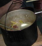 鶏モモを焼いてから煮るとよい。ヨブスマソウなどは投入して煮えたらすぐ食べる |