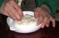 | 皮をむく。いびつだとこれが大変。きれいなものはタワシで洗ってからヒゲ根を火であぶって焼き、皮ごとすりおろしてもよい。黒くなるやつとならないやつがある。 | ||