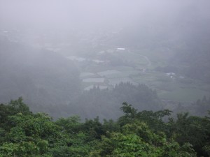 霧の中の谷 飛梅山荘(まだないけど)は左中央の山陰 ♪シロツメグサの花が咲いたら さあ いこう・・