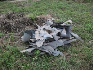 畔シートはがし 畔シートの山! 畔を崩して低くすれば, 水はけ改善の一助となるか??