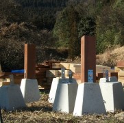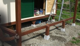 今日は、ポーチの柱を入れる作業と、壁材のはりつけ。