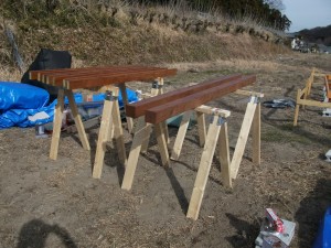 モールの塗装2回目。 根太にも塗装。温かい日で、1日で根太は2回塗りができた。