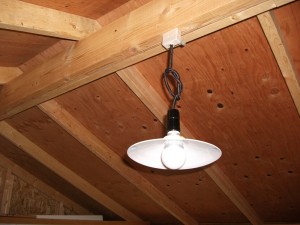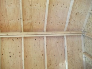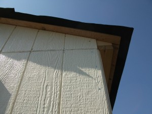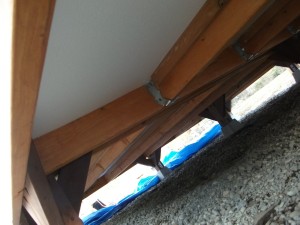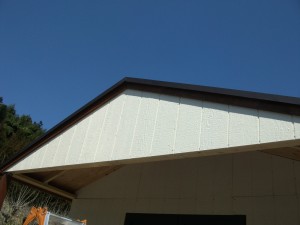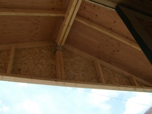 妻部分にモールをはったら、小屋の顔つきが大分引き締まったかも? ポーチの屋根を見上げてみた。