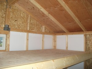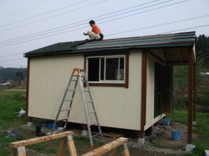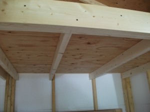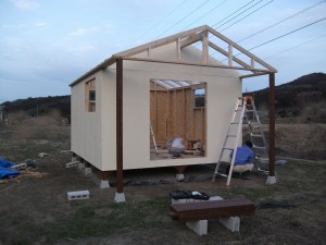 屋根合板が全て張れ、小屋の全貌が現れた。 アスファルトルーフィングがはれたので、雨対策もひと心地ついた。