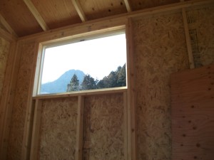 窓から山が見えるのは嬉しい!(窓も全部入った!) 屋根合板のはりつけ。