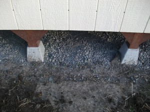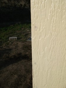 釘あとのコーキング。 雨垂れのあとが地面にくっきり! 束にもかなり跳ね返りあり。 雨樋の必要性痛感!