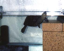 窓を開けてひなたぼっこ。 ああ〜いい気持ち この時は水を減らしていましたが 寒い夜はここをベッドにして、温かい水のお布団で寝ています。 (水温はヒーターで26度前後に調節中) カメもやっぱり考えてるなあ・・・ |