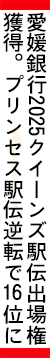 愛媛銀行プリンセス駅伝16位 愛媛銀行陸上部、苦節10年。クイーンズ駅伝予選会プリンセス駅伝の最終区間で日立・ニトリに競り勝ち予選通過最下位の16位でゴールし出場権を獲得した |