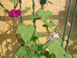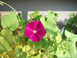 ANZI 「安爺さん、毎朝給水のたびに変わる朝顔の葉穴。」 「早い時期にバッタの子の仕業じゃと。」