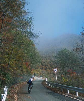 大峠まであとわずか,雲海の上に出ると カラマツが金色に紅葉している。