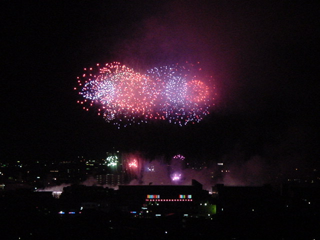 実はジムは特等席なのだ。打ち上げ場所からは2km以内だしここはビルの12階。ジムはがら空きなのに花火が見える方にあるジョギングマシーンだけは全台満員御礼(笑)。ボク達も結局最後まで堪能させていただきました。